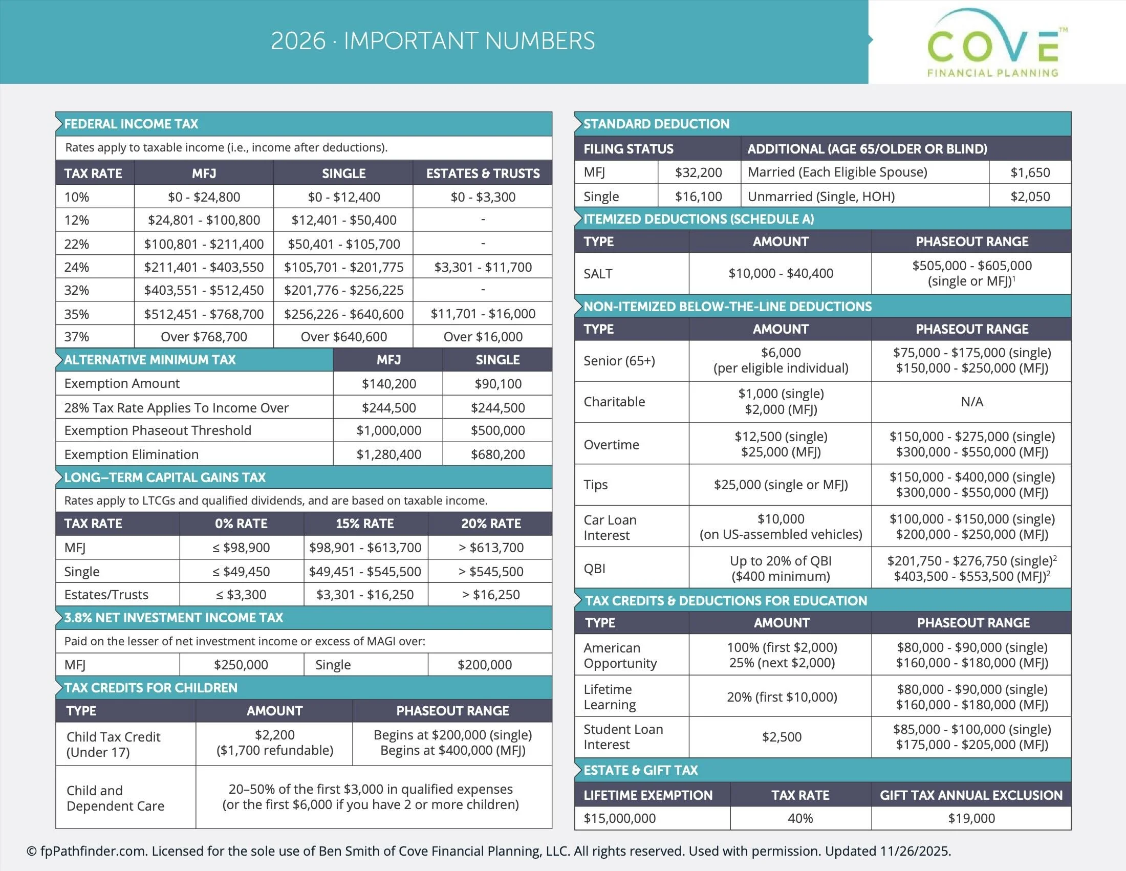 Do you have questions about how these tax numbers compare to 2025 and impact your financial plan? Reach out to me at Ben@coveplanning.com or schedule a free consultation call.