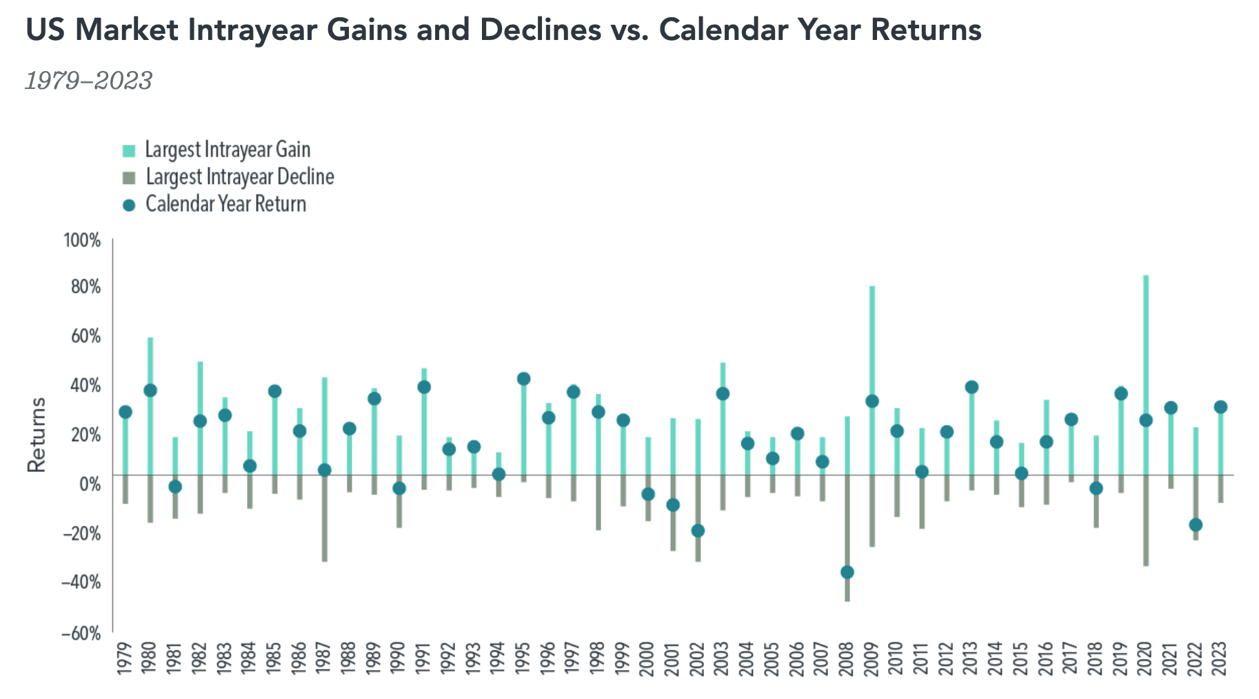 For instance, look at the largest declines for the US stock market in every year from 1979 to 2023. Those declines average to -14%.