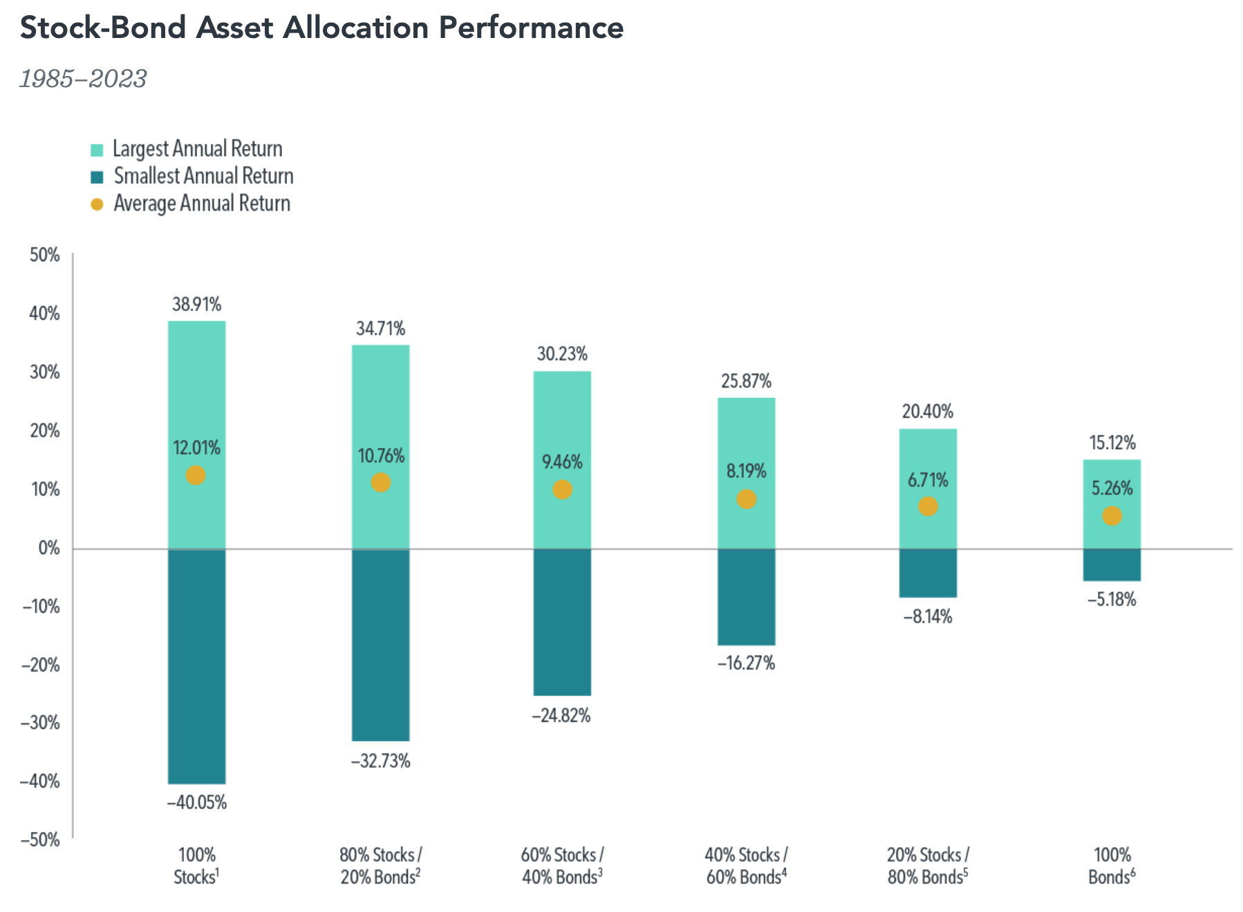 The more you invest in stocks (vs. bonds) the higher your return potential but the greater your potential downturns.