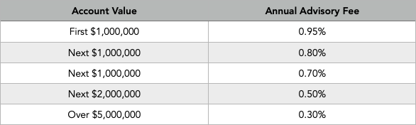 Our annual fee ranges from 0.30% to 0.95% of assets under management (AUM) based on the table below.